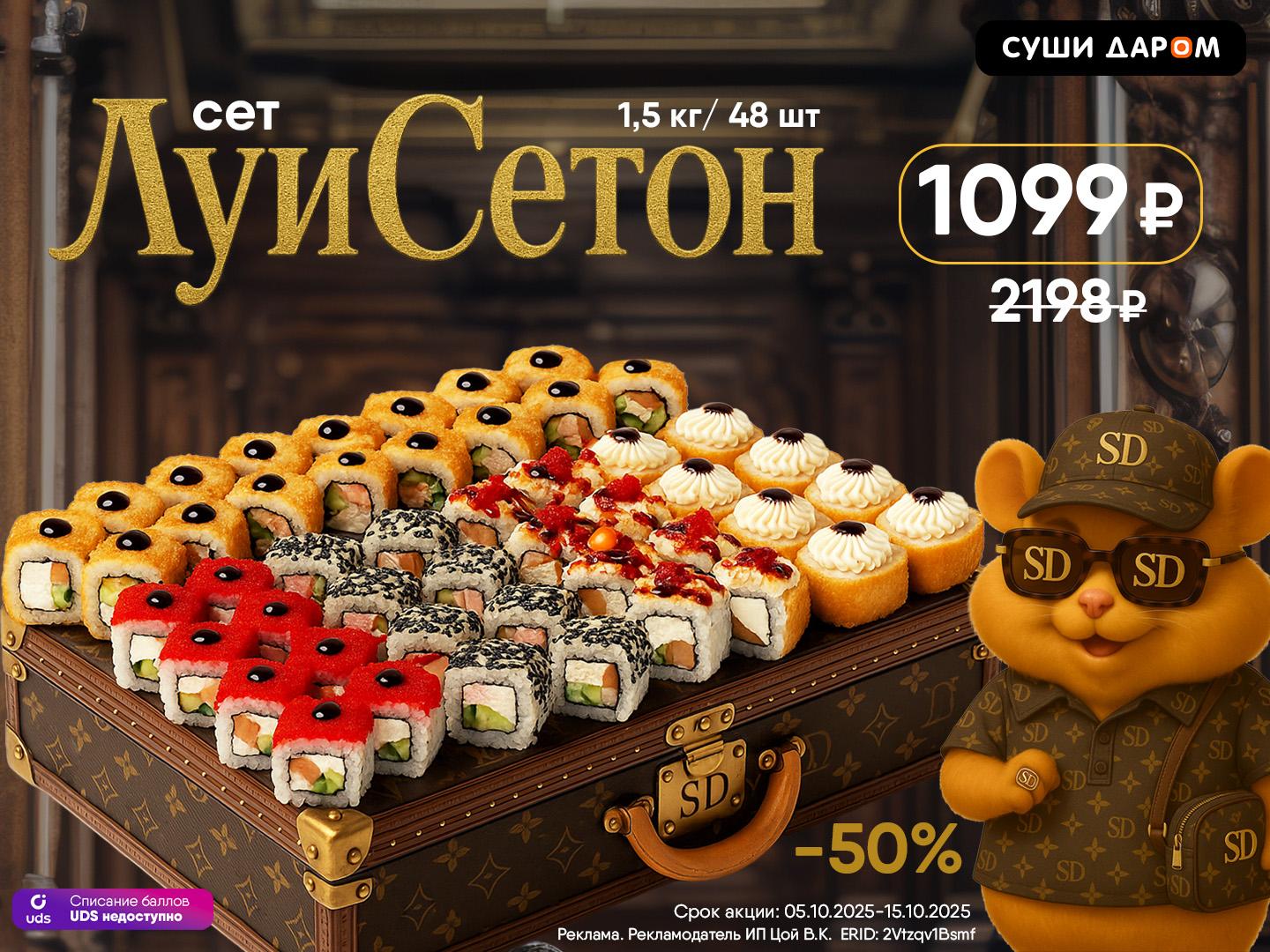 Когда вечер сам себя не накормит [br][br]Берёшь ЛуиСетон — 1,5 кг за 1099 ₽ и забыл про готовку.[br][emoji=:orange_heart:] Вечеринка? — да.[br][emoji=:orange_heart:] Сериал? — да.[br][emoji=:orange_heart:] Просто поесть вкусно и много? — ДА![br][br]Сет уже ждёт тебя в «Суши Даром».[br][br] Срок действия акции с 5 по 15 октября 2025 года.[br]*Списание баллов UDS невозможно.[br]**Количество товара ограничено, наличие товара уточняйте у кассира по телефону 8 (923) 792-71-55